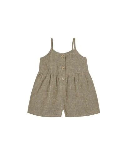 This jumpsuit features coconut buttons down the center front and a cute and comfy fit.