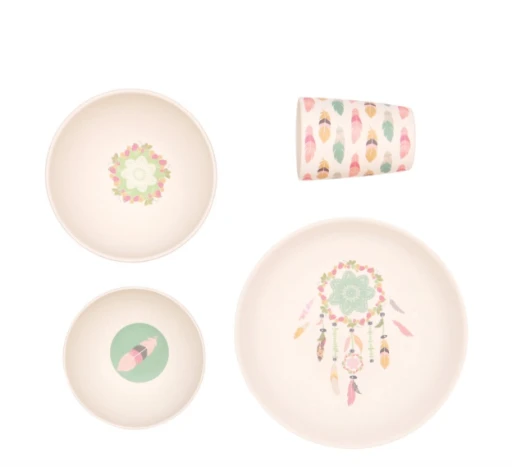 Surely you would love your little one eating off such a beautiful bamboo dinner set. Love Mae dinner set is made up of 4 pieces of quality bamboo items that are perfect for you and your little love. The quality is amazing and of course the design is too cute for words. Please know that as much as we wish things could last forever our bamboo can be broken when dropped. It does not smash like ceramic, but occasionally when it hits a hard floor a chip or crack may occur. We recommend you treat it carefully and with love. It will then love you back and last gorgeously while your little one grows up. Care is taken for the postage of this item, however sometimes there is damages in transit. We do apologise for any inconvenience. This dinner set includes: 22.7cm high sided plate (8.7″), 16.3cm large bowl (6.5″), 14cm bowl (5.5″) & 7.6cm Tumbler (3″). – Toxic-free – Biodegradable – Dishwasher top rack as recommended – FDA & LFGB food safe approved – Recommended working temperature: -20oc to 80oc – Not suitable for microwave or oven use – Stain Proof – Supervision with this product is recommended at all times for children under 4 years old.