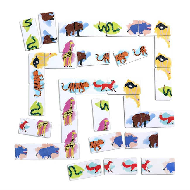 Take this Animal Parade everywhere you go! From snakes to giraffes, our Animal Parade Head to Toe Dominoes will delight children at home, at Grandpa’s house, or on vacation. A great little size to toss in your bag and take on the go. Illustrated by Monika Forsberg.