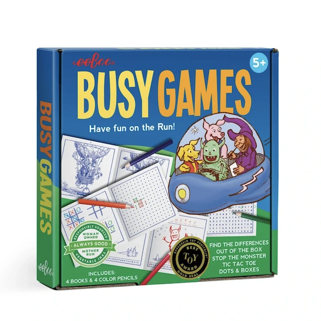 Perfect entertainment for road trips, long or short! eeBoo’s Busy Games features 5 classic games in 4 fun booklets. Using the included 4 color pencils play Tic Tac Toe, Dots & Boxes, Stop the Monster, Out of the Box, and Find the Difference. Stop the Monster is played like Hangman and Out of the Box is a Number Maze. Little ones and adults alike will be entertained for hours! Illustrated by Saxton Freymann.