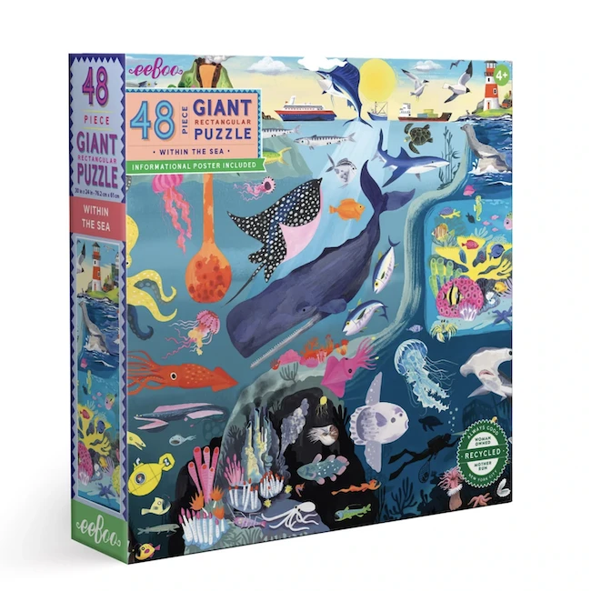 Aquatic creatures of all sizes from the well-known to the obscure populate this giant puzzle, with layer upon layer of fascinating detail to be discovered. Everything is labeled for further investigation on the amply sized poster included. The intelligent and fanciful artist Linda Bleck has created this enormous puzzle. Filled to capacity with detail and delightful moments of discovery, this puzzle covers new ground in the floor-puzzle category, making this format both a fully educational activity and a rich individual play experience.