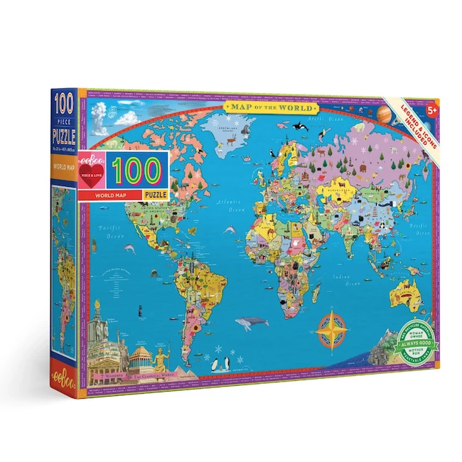 eeBoo’s award-winning World Map 100 piece jigsaw puzzle will provide wanderlust to all ages! Countries and oceans, landmarks and beasts make our world what it is, North, South, West and East. Learning about it can be such a snap if you spend lots of time looking over this map! Also includes a glossary and icons. Illustrated by Saxton Freymann. This educational 27 x 18 inch rectangular puzzle has been thoughtfully commissioned and beautifully designed in an ideal format for transitioning from simple children’s puzzles to more challenging adult jigsaw puzzles. They offer a screen-free, relaxing way to practice patience and concentration while sharing a gentle cooperative activity with friends and family.