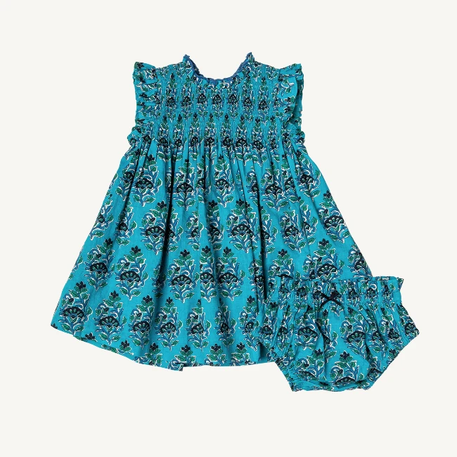 The brilliant color of our Azure Posey Block print gives us the good kind of blues on our our smocked Girls Stevie Dress. A sweet ruffled neckline adds to the charm. Fully lined, with a zipper closure. You’ll find our Azure Posey Block Print on our Baby Girls Stevie Dress Set,