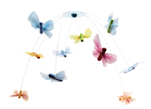 The colorful butterflies flutter happily back and forth when a gentle breeze moves the mobile. The movement encourages little explorers to take a look. Materials: Wooden butterflies with textile wings and metal rods. Dimensions: Diameter approx 14.5″ Width: 14″ diameter Made In: China Materials: Wood, metal