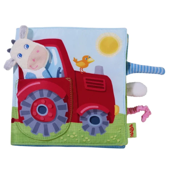 The soft fabric book encourages youngsters to look, feel, play and โgraspโ. The finger puppet cow goes on a tour of the whole farm where she has many fun adventures. Flaps, squeaker and reflective foil invite the reader to look and discover. This colorful fabric book is a constant source of entertainment.