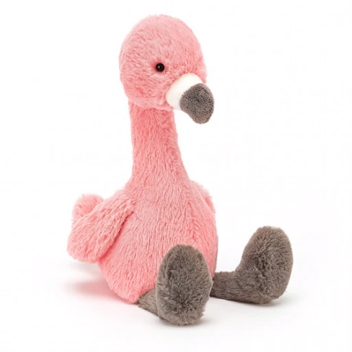 Bashful Flamingo is bubblegum-pink and a very good friend to babies and tots. This bonny bird is soft and squeezable, with a long, stand-up neck, tufty tail and nuzzly mocha feet and beak. Take this winged wonder to the park or the pond and watch the world flap by.
