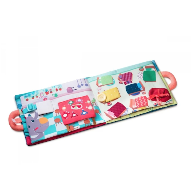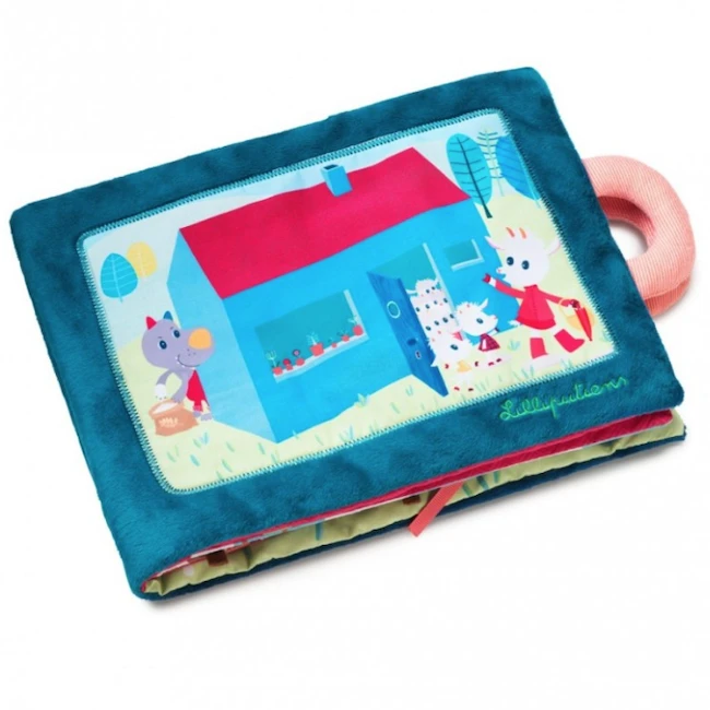 Kids love stories and especially when they can participate. In this interactive fabric book children help mother goat searching for her little ones by opening different closing systems (knots, clips, button,..). A real boost for little hands their fine motor skills. Thanks to the handles, this book is easy to take along.