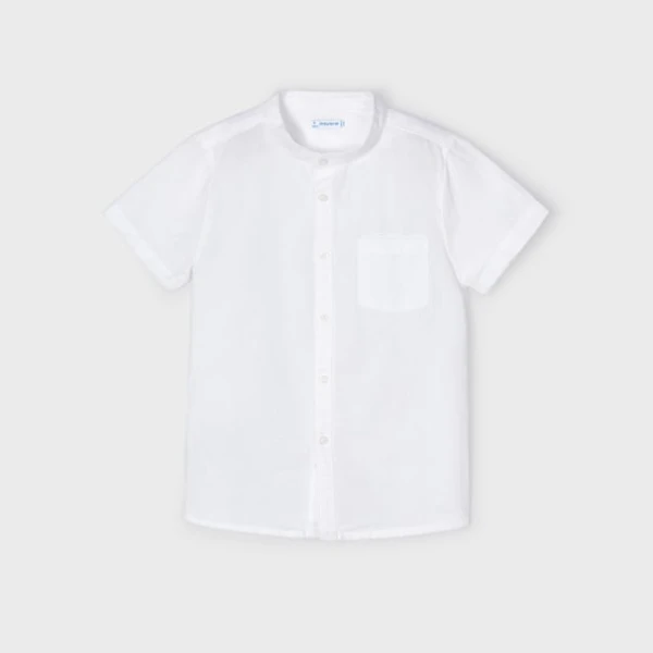 Short sleeved Shirt for boy. Mandarin collar in same color. Button fastenings down the front. Fresh and contemporary fabric with linen. Functional front pocket.