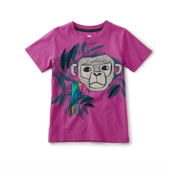 This Caribbean-inspired graphic features the cutest monkey face with a bonus bird–so colorful. Crafted from 100% soft cotton jersey.