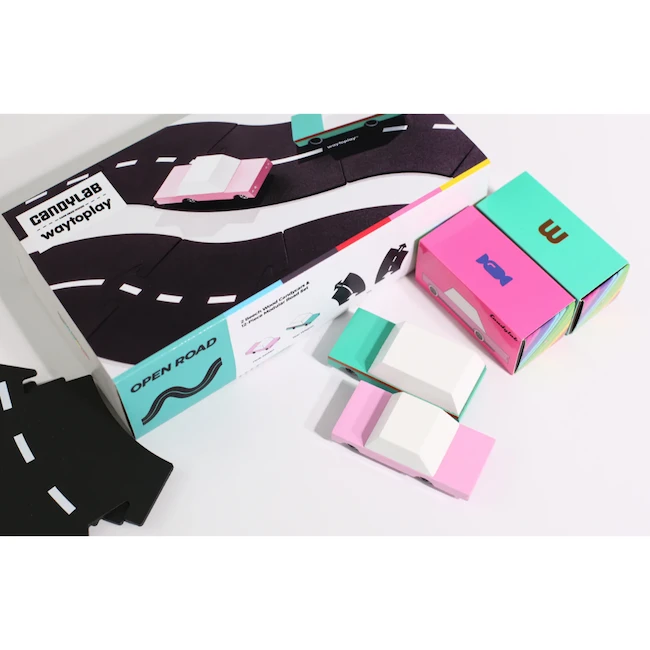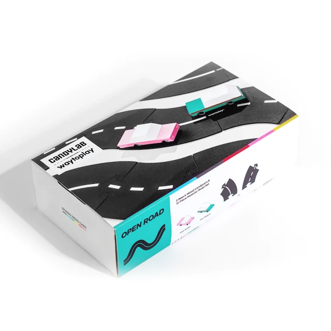 Why stick to the straight and narrow? The Open Road Set includes 12 curved Road Pieces, sure to get you where you need to go (just not in a straight line). A Teal wagon and Pink Sedan accompany this set for a scenic drive. Great for winding paths, free form play, and creating your own adventure.