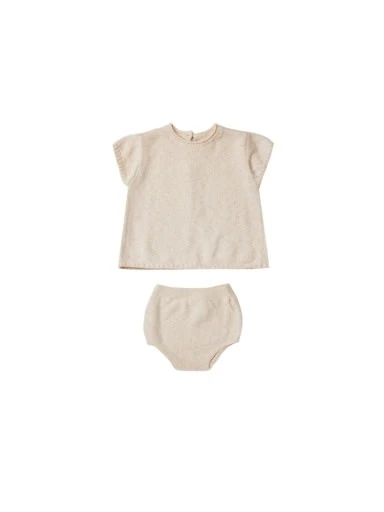 Our Penny Knit Set features a cap sleeve with a full body and an opening back with three button closure and coordinating knit bloomers.