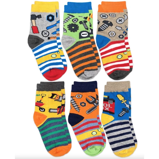 Jefferies Socks boy’s crew socks feature fun tool designs and stripes, color block heels, cotton rich blend, and stay-up top. Colorful hammers, wrenches, saws, drills, screws, rake, wheel barrow, shovel, screw drivers, and more are knit in to these socks. Perfect for dressing up or down, school, birthdays, gifts, casual wear, play, and everyday.